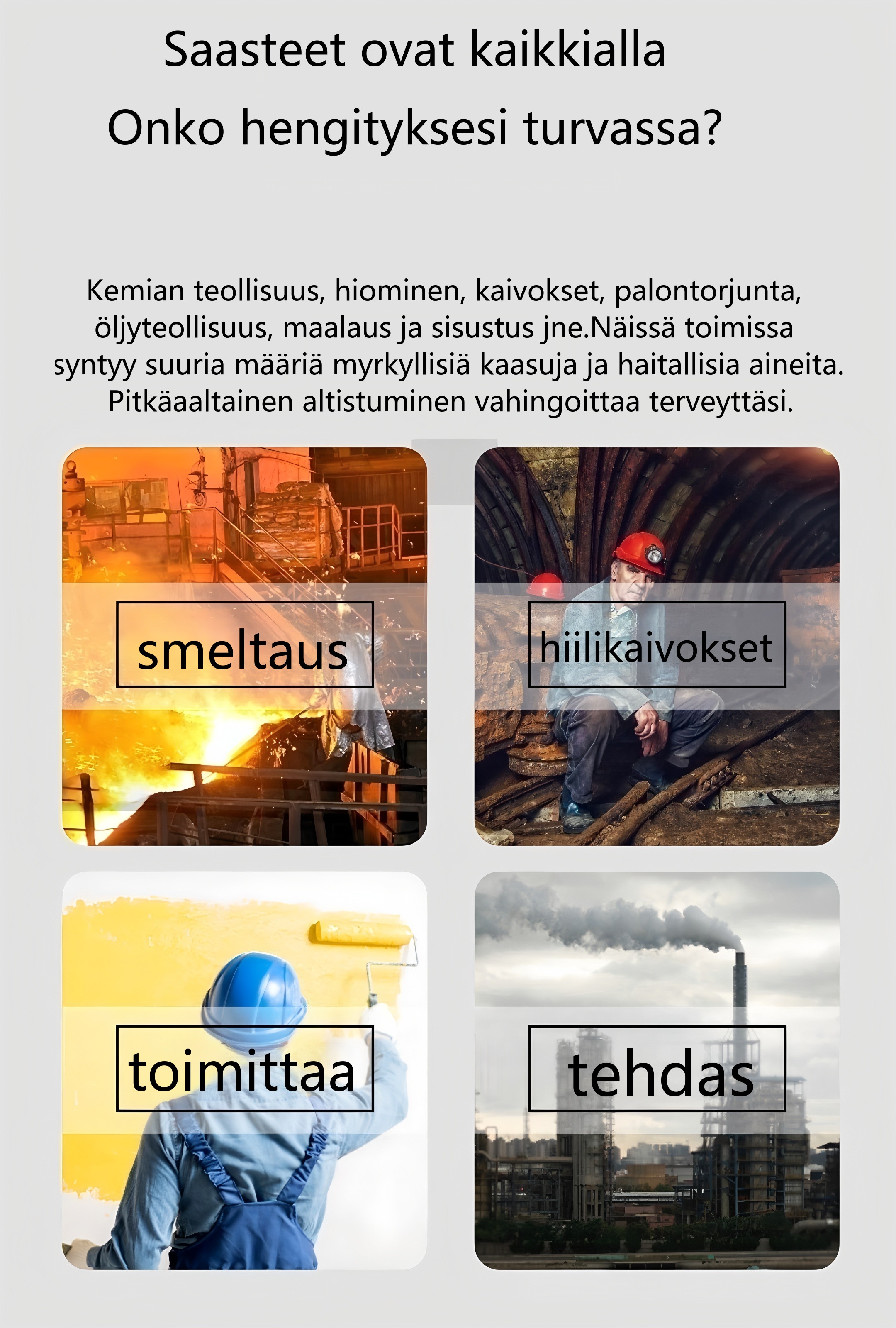 【Pakkaus sisältää】 1 x puolinaamari, 1 x suojalasit, 2 x suodatinpatruunaa, 20 x suodatinvillaa.