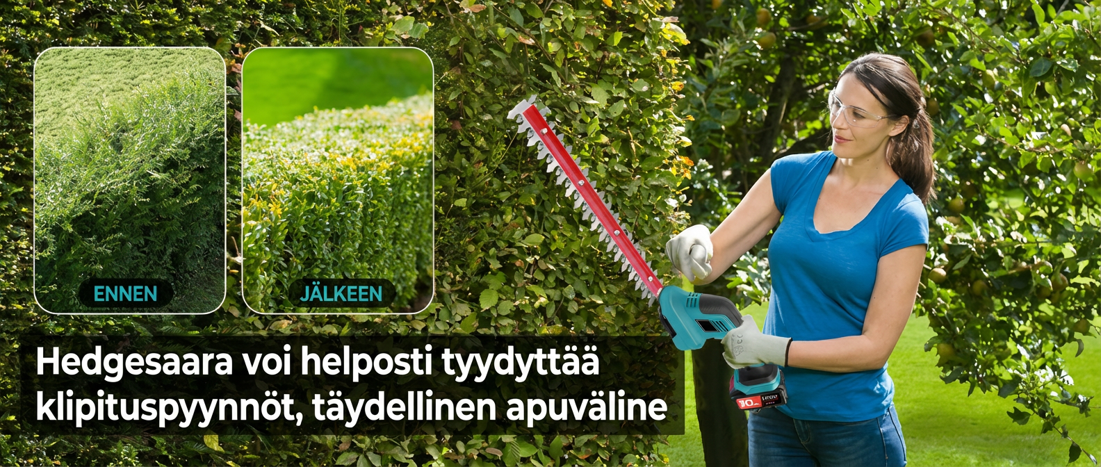 Tämä monikäyttöinen sähköpensasleikkuri on suunniteltu kotipuutarhoihin, yhdistäen ruohonleikkuun, pensaiden muotoilun, pensasaitojen leikkauksen ja pienten oksien karsinnan yhteen kätevään työkaluun. Tehokkaan moottorin ja terävien terien ansiosta erilaiset puutarhatyöt sujuvat tarkasti ja vaivattomasti. Olipa kyse pensaiden muotoilusta, aitojen siistimisestä tai nurmikon reunojen viimeistelystä, lopputulos on aina siisti ja ammattimainen. Kevyt ja ergonominen muotoilu takaa miellyttävän ja sujuvan käytön – täydellinen valinta siistin ja kauniin puutarhan ylläpitoon!